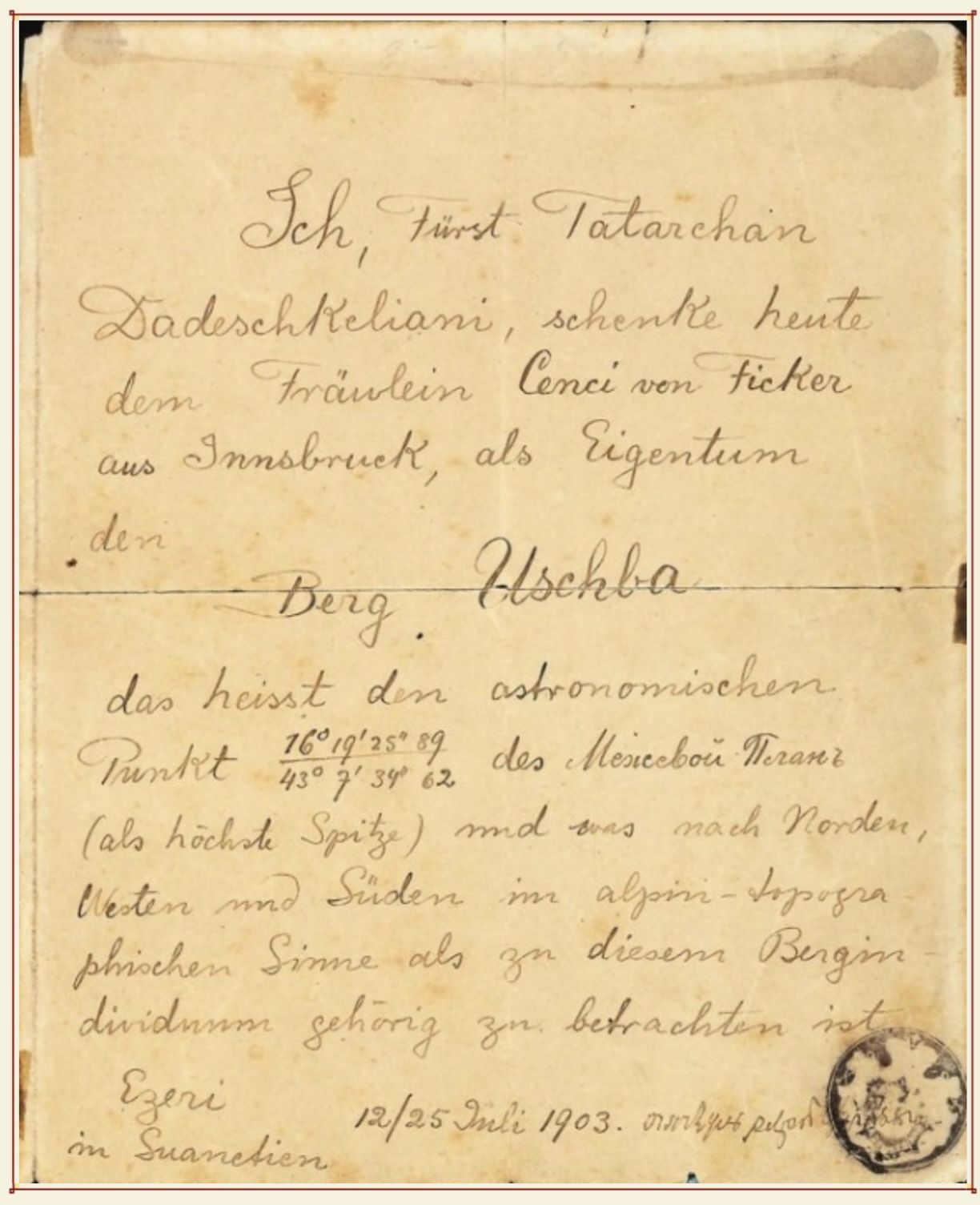 Я, князь Татархан Дадешкелиани, отдаю госпоже Ценци фон Фикер из Инсбрука в собственность гору Ушба, имеющую координаты 16 19'25"89 восточной долготы и 43 7'34"62 северной широты и являющуюся самой высокой вершиной этого района, и все, что примыкает к этой вершине с севера, запада и юга в альпинистско-топографическом смысле.