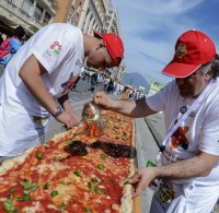 Неаполитанцы взялись приготовить самую огромную пиццу в мире, чтобы побить прежний рекорд Гиннеса, принадлежащий миланцам. И им это удалось: чтобы выложить итальянское национальное блюдо гигантской длины, понадобилось выстроить столы на городском побережье в почти двухкилометровый ряд. Над приготовлением рекордной пиццы длиной почти два километра, если точно 1853, 88 метра, работали более 400 поваров на протяжении 11 часов. Гигантское национальное блюдо готовили в жаровой печи с дровяным подогревом. Когда рекорд был официально зафиксирован, пиццей-рекордсменом смогли угоститься все зрители. Оставшееся затем отдали нуждающимся. Как сообщает агентство "Франс пресс", для изготовления этого гигантского блюда потребовалось:…